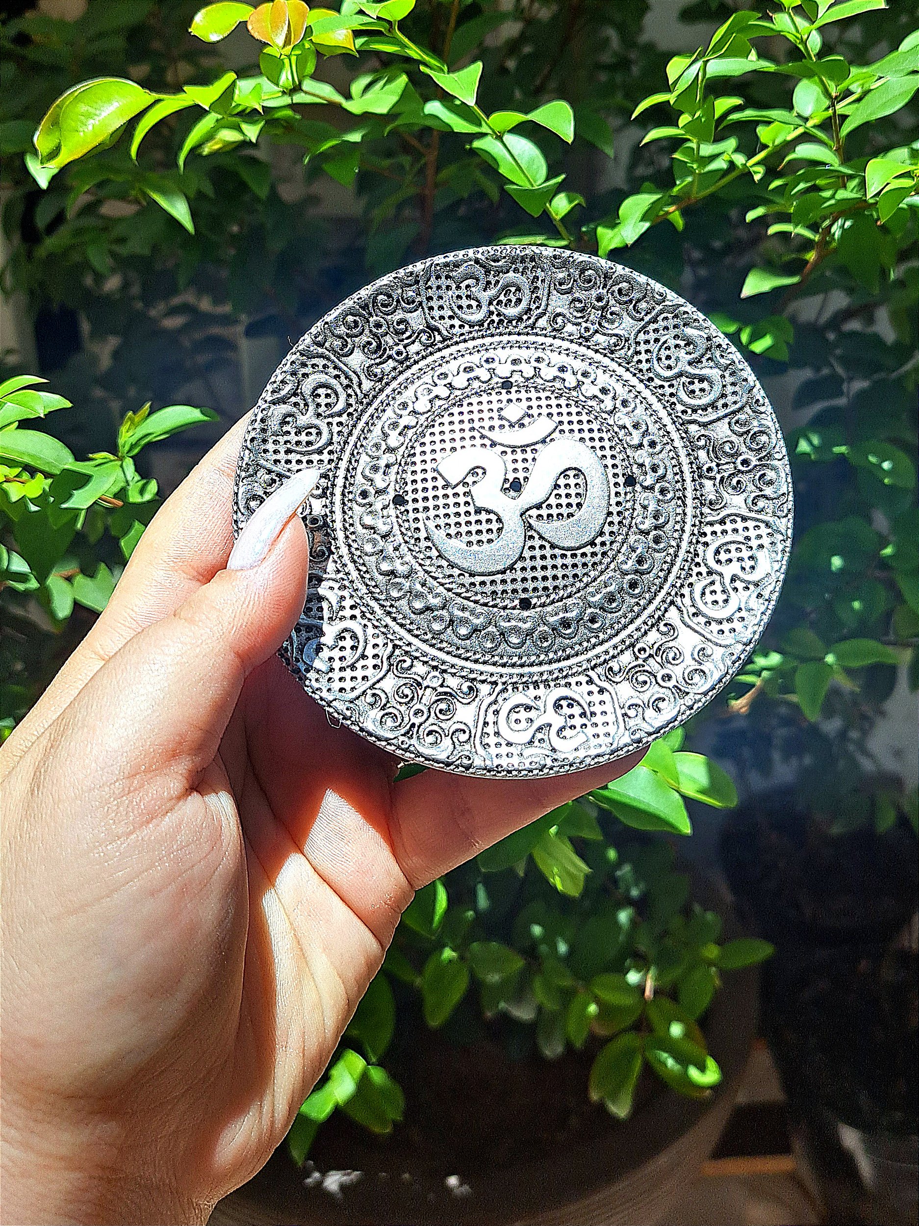 Significado do símbolo: Om nada mais é do que um mantra, ou seja, a combinação de sílabas sagradas que formam um núcleo de energia espiritual e que funciona como um ímã para atrair, ou como lente para concentrar as energias espirituais. O Incensário Redondo em Resina - Prata é um par perfeito para os incensos que promovem a energização e prosperidade.